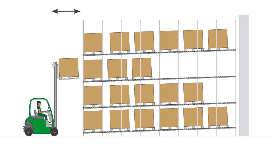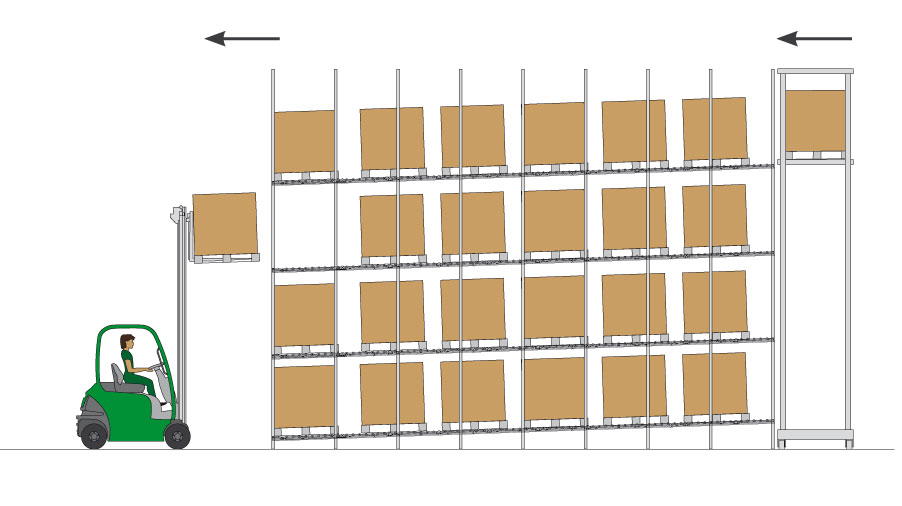 Einschubregalbahnen arbeiten nach dem LIFO-Prinzip. Es werden also die Güter zuerst entnommen, die als letztes eingelagert wurden. Bis zu sechs 1000 kg schwere Paletten können mittels Stapler in den Kanal eingeschoben werden. Eine Separierung und Abbremsung ist i. d. R. nicht erforderlich - dadurch entstehen deutliche Kostenvorteile gegenüber Durchlaufbahnen.