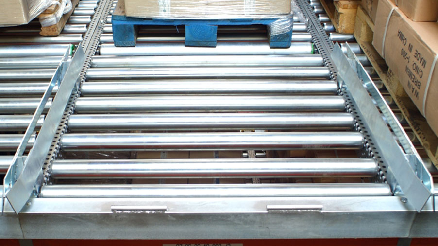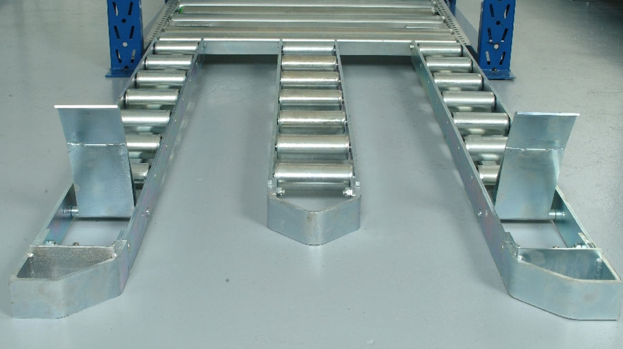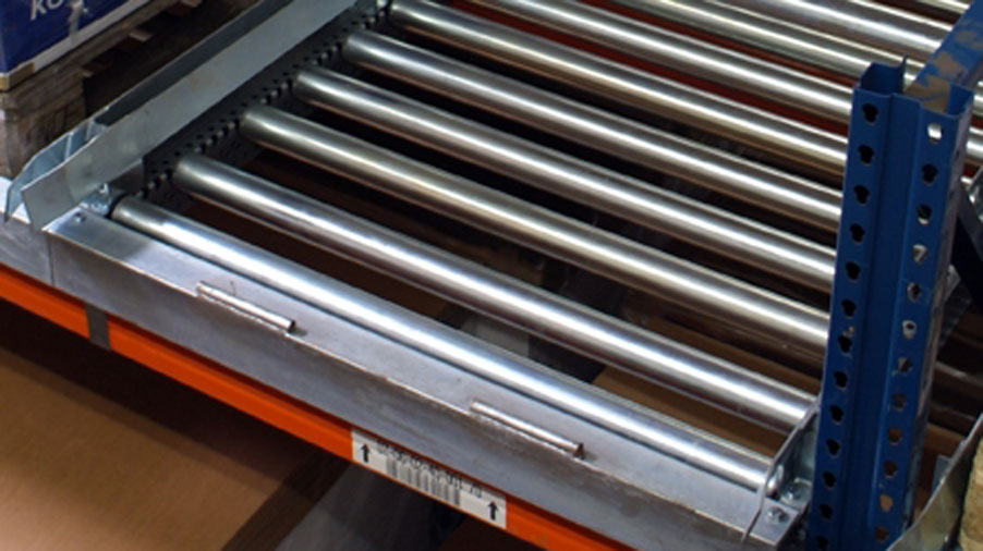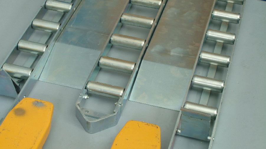 Damit die Rollen im rauhen Alltag vor Stößen z. B. mit den Staplergabeln geschützt sind, gibt es das Rollenschutzprofil (RSP). Dieses massive Bauteil schützt die Rollen im Paletten-Aufgabebereich.