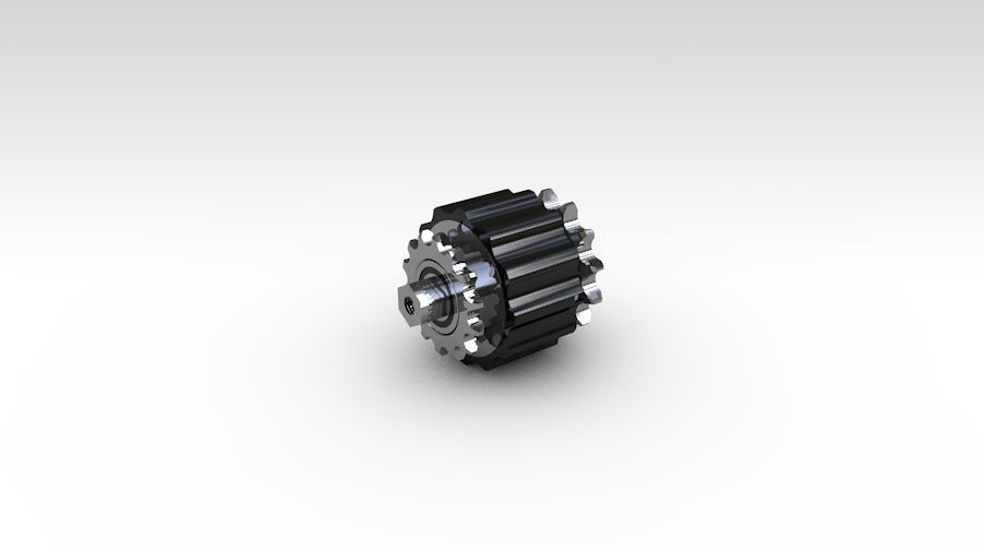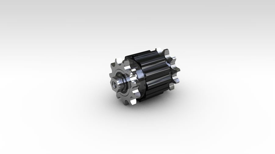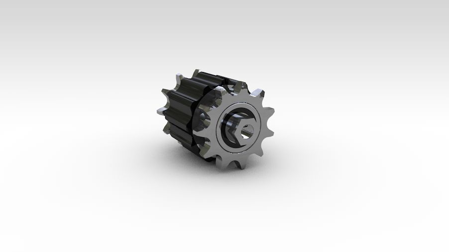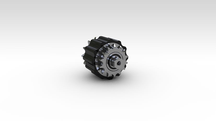 Transport von Gütern mit einem Gewicht von bis zu 120 kg. Auf beiden Seiten der Kupplung befindet sich ein Kettenrad 1/2 x 5/16" z11, wobei eines mit einer tangential angetriebenen Kette angetrieben wird und das andere den Antrieb auf den Stauplatz umleitet.